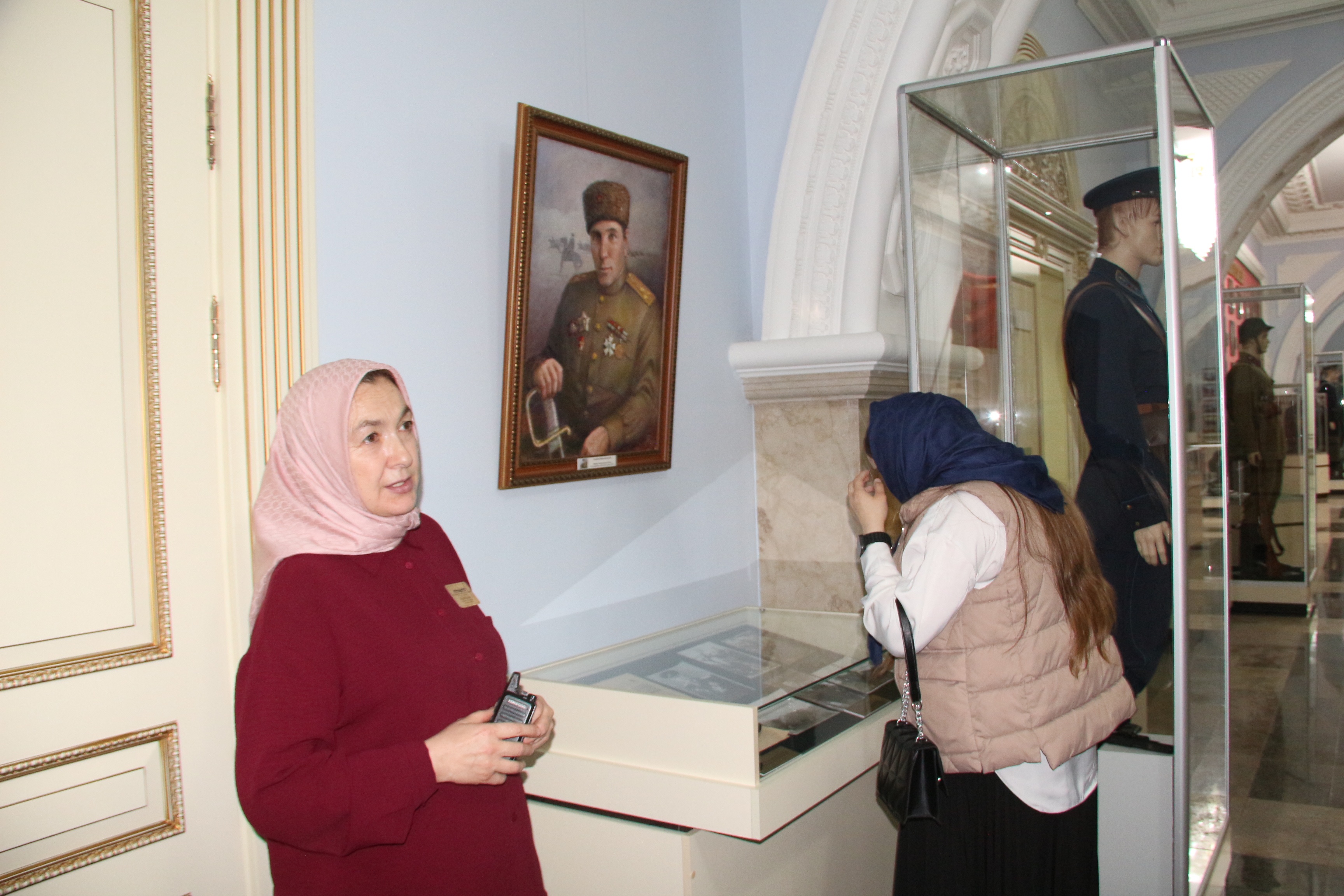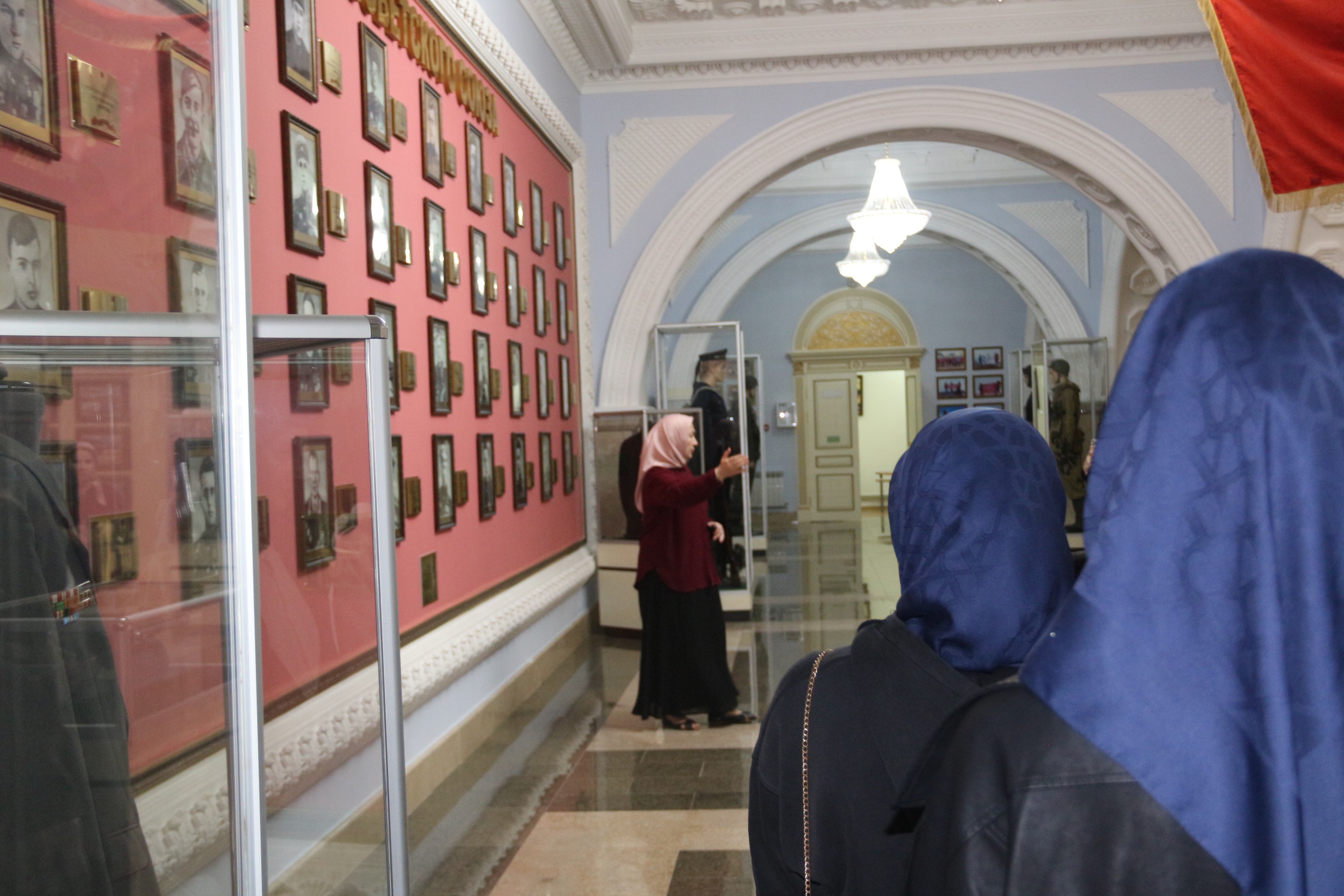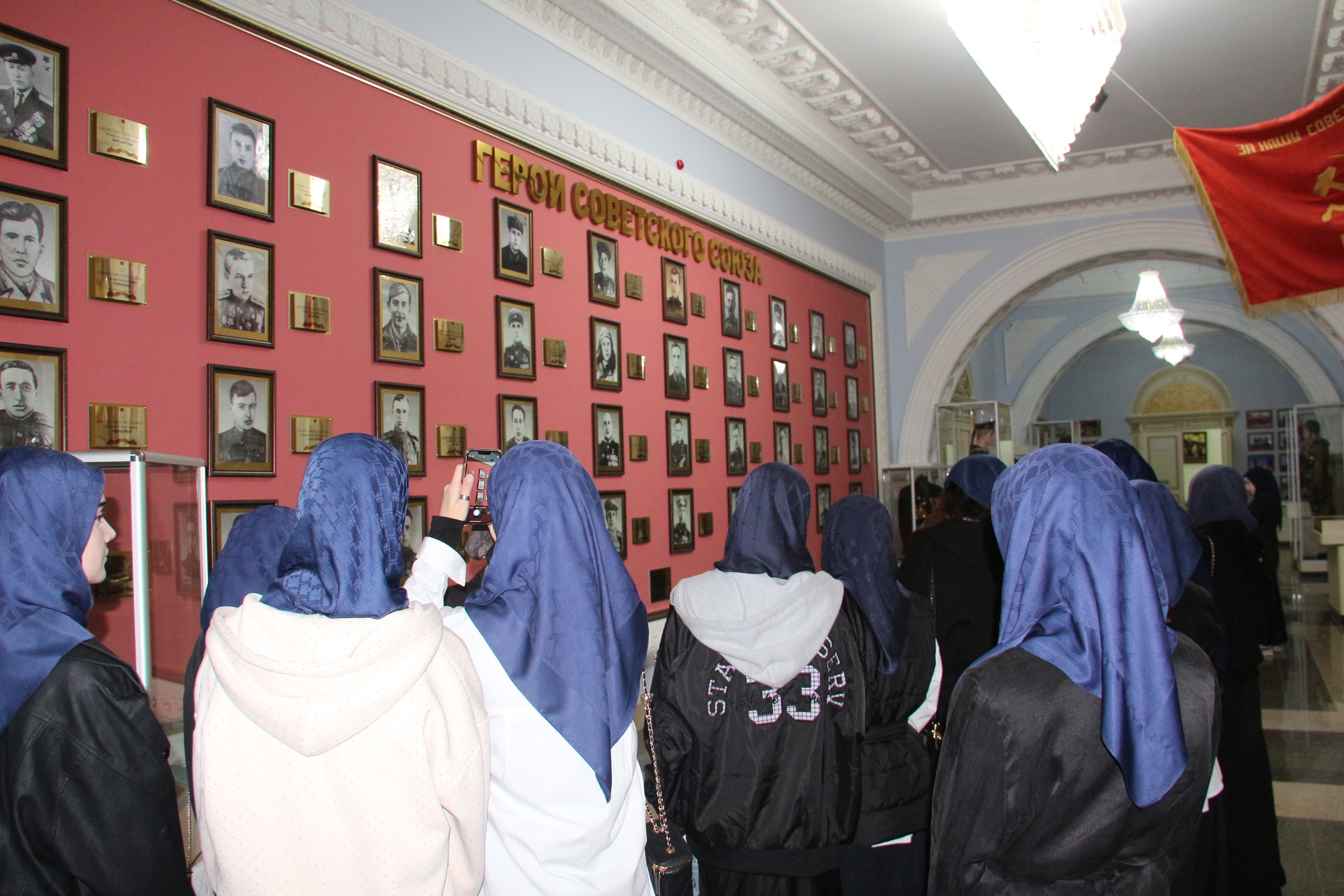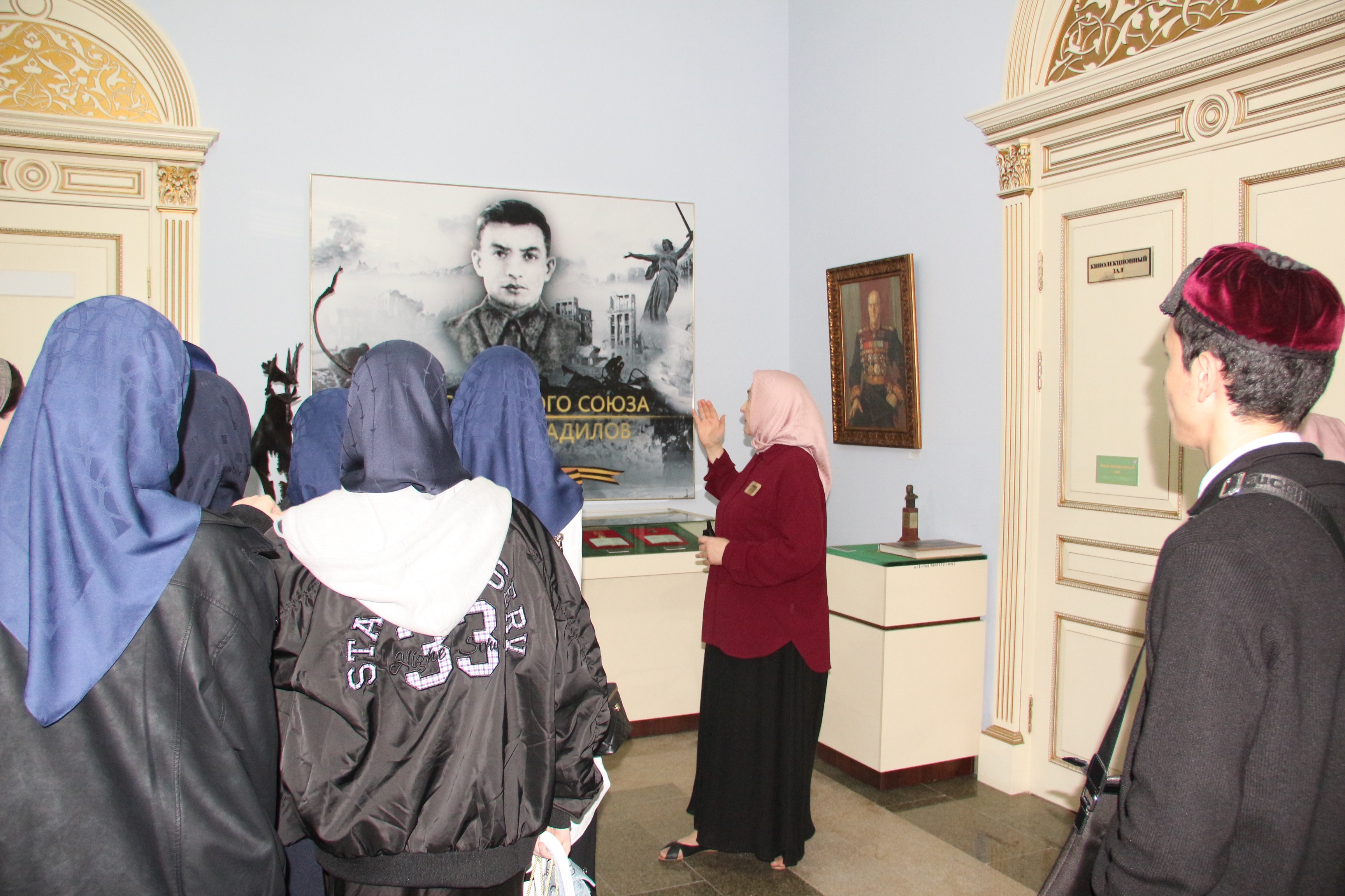 Основной интерес студентов привлекла тема Великой Отечественной войны. Под руководством сотрудницы музея, студенты рассмотрели барельефы с изображением Героев СССР уроженцев Чечено-Ингушетии, барельефы с изображением эпизодов Великой Отечественной войны, Памятник Маташу Мазаеву и танкистам Великой Отечественной войны и другие экспонаты.